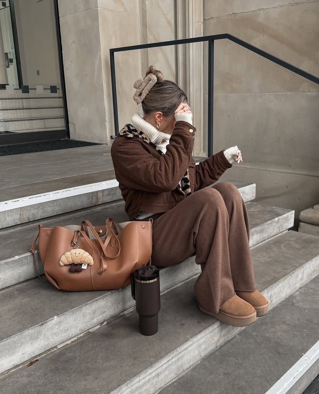 Warm tones reign supreme in this sophisticated monochrome look. A rich brown cardigan layered over a white turtleneck exudes earthy elegance, while matching wide-leg trousers add flow and comfort. Tan UGG-style boots and a camel tote keep the vibe cozy, while a leopard-print scarf adds playful flair. This outfit is proof that tonal dressing can be as fashionable as it is functional.