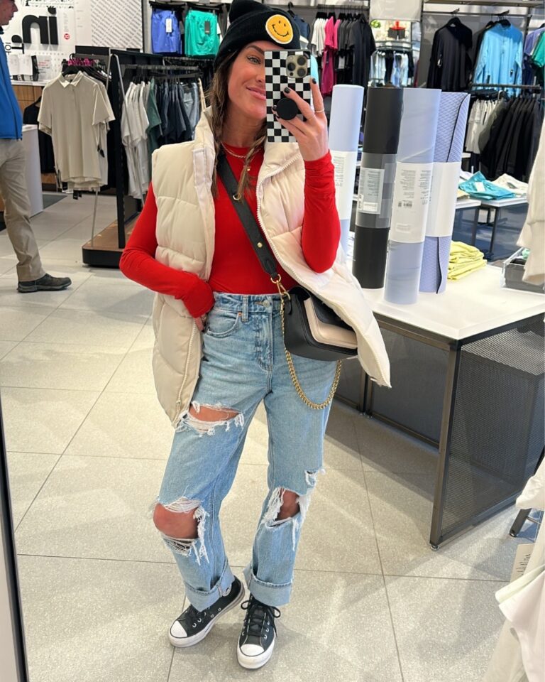Vibrant and versatile, this outfit is proof that layering can be both fun and functional. A cozy cream puffer vest layered over a fiery red sweater keeps you snug while adding visual interest. Pair with distressed jeans for a relaxed finish, and opt for classic sneakers for all-day comfort. Throw on a cute beanie and a crossbody bag, and you’re ready to tackle the school day — warm, confident, and stylishly coordinated.